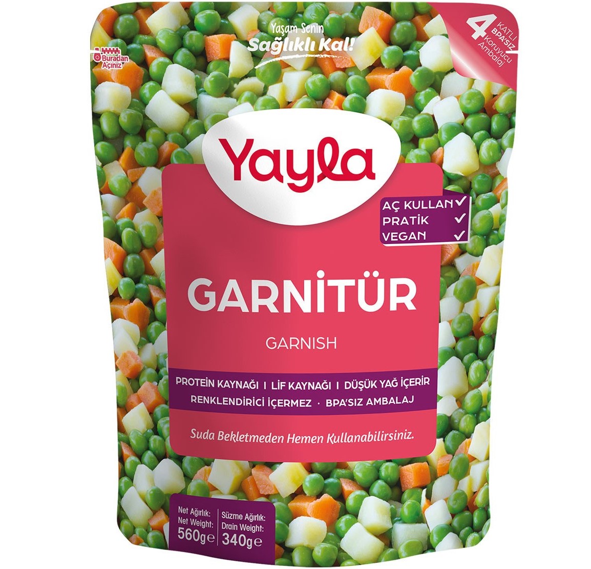 Ingredients: Peas (30%), potatoes (15%), carrots (15%), water, salt.